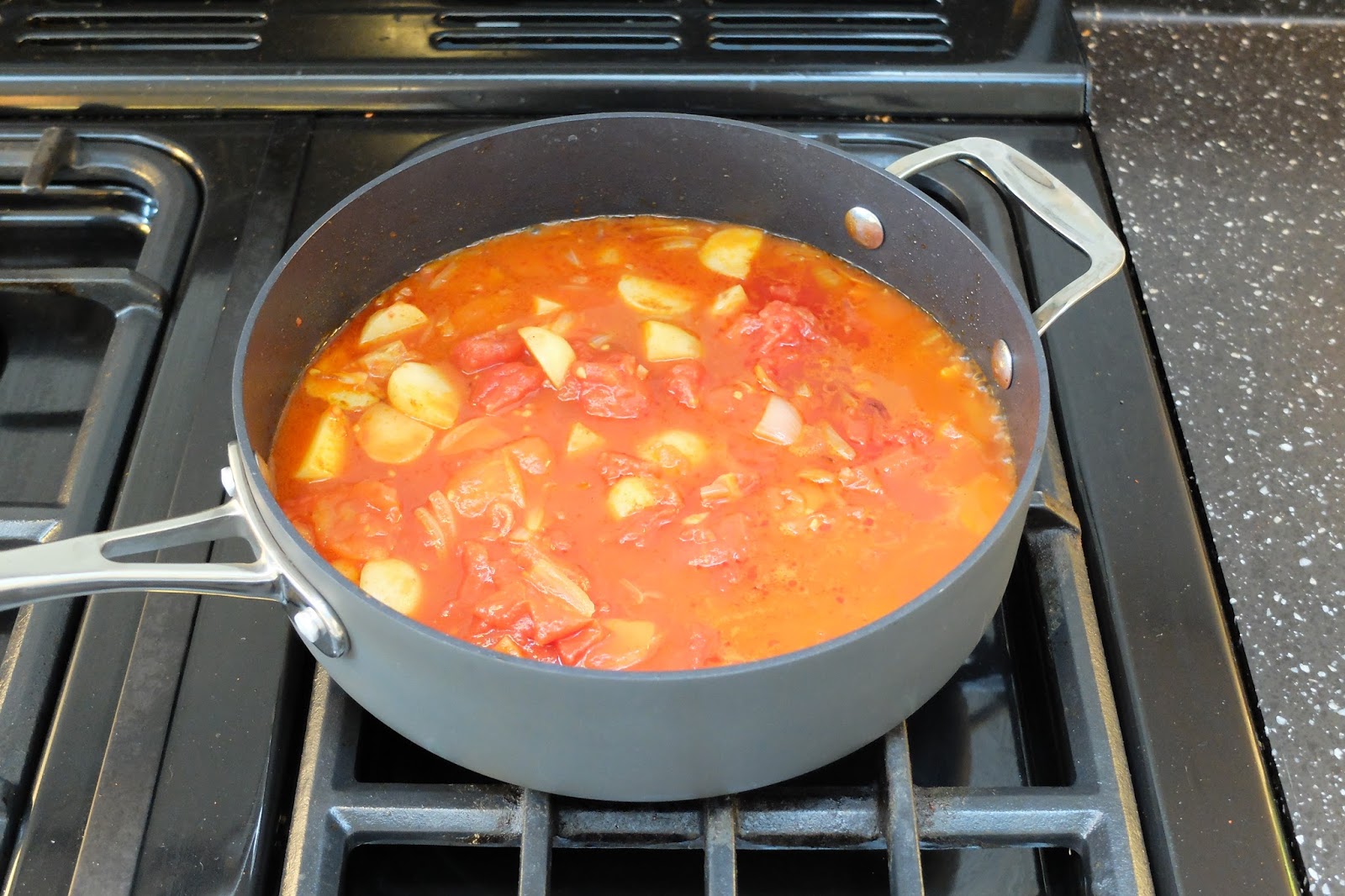and chopped garlic into the pan and fry for about a minute. Stir in the chilli